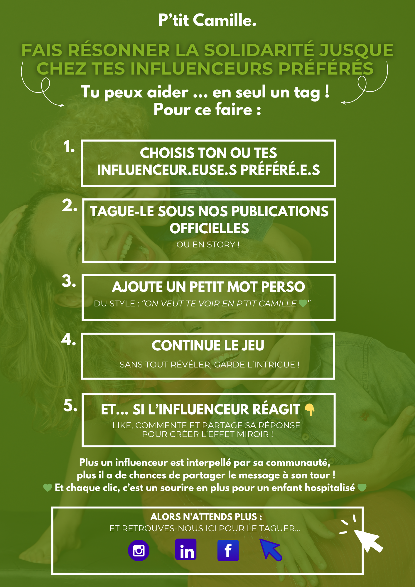 Tu suis un ou plusieurs influenceurs humains et inspirants ? Télécharge nos conseils pour l'inviter à rejoindre l'aventure "P'tit Camille". Un seul de leurs posts peut tout changer pour les enfants !